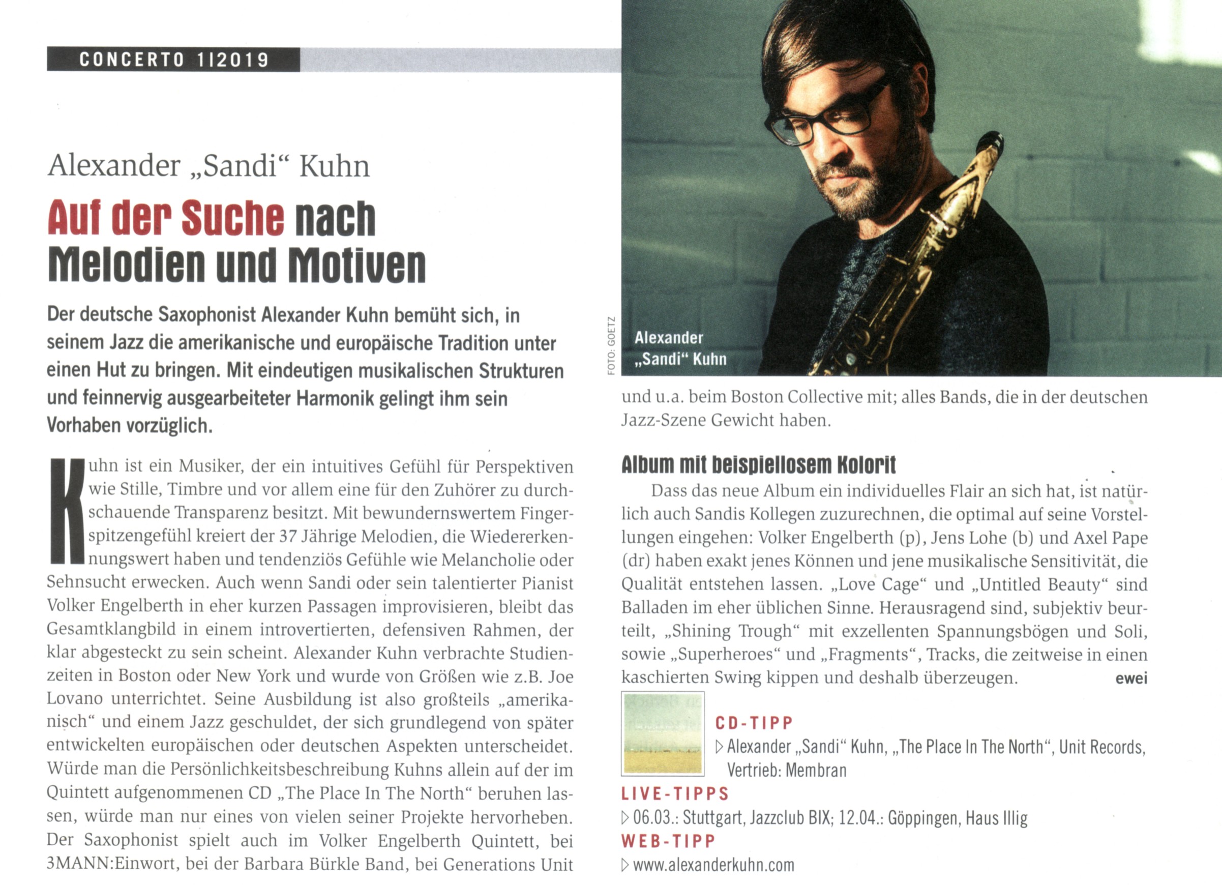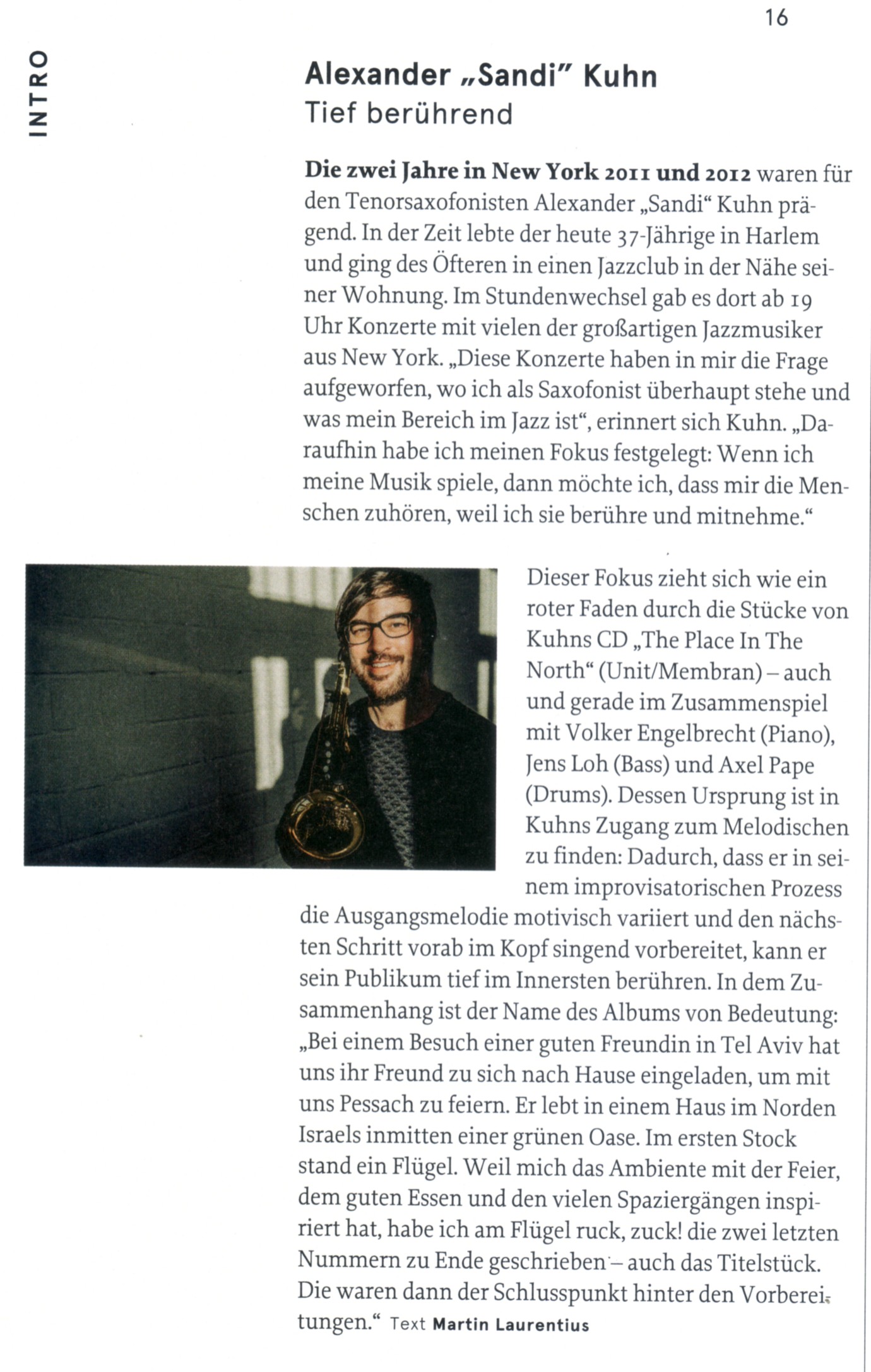 „Viele junge Saxophonisten mit erstaunlicher technischer Reife tummeln sich auf der europäischen Jazzszene, aber nur sehr wenige von ihnen entwickeln eine unverkennbar eigene musikalische Sprache, zu der weitaus mehr gehört, als nur die Beherrschung des Instruments. Alexander „Sandi“ Kuhn ist ein solcher Musiker […] Sandi Kuhn ist wirklich jemand, der es versteht, Geschichten zu erzählen.“